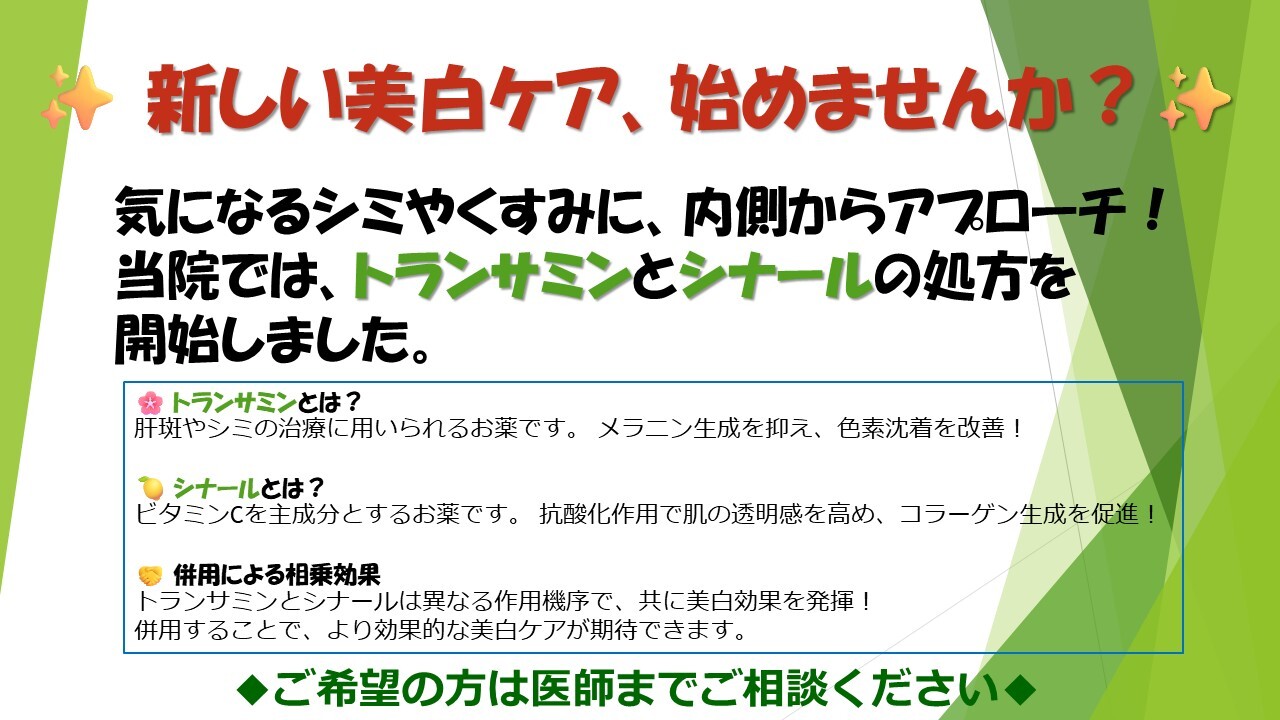 お肌のシミ治療薬のトランサミン、シナールの処方を開始いたしました。ご希望の方は当院医師までご相談ください。